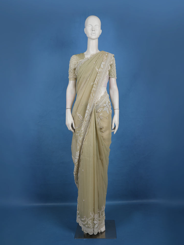Dusty Purple Organza Saree With Sequin Embroidered Border And Velvet Blouse - Diadem