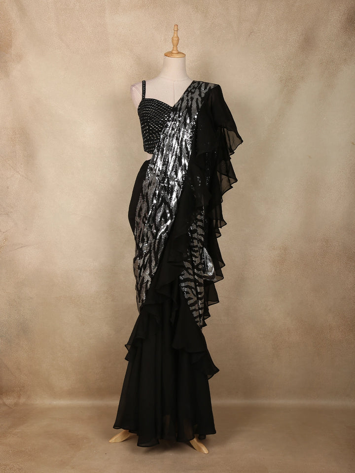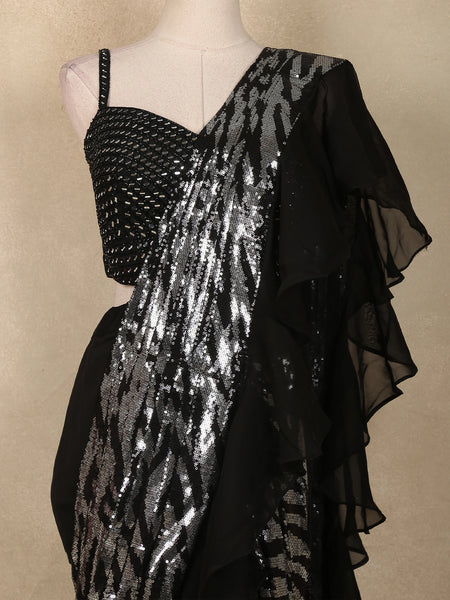 Black Sequin Embellished Pre-Draped Georgette Saree with Sleeveless Blouse - Diadem