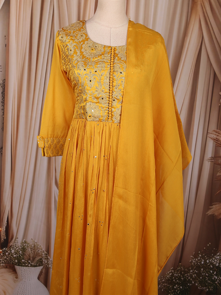 Yellow Floral Woven Silk Anarkali Gown - Diadem