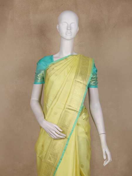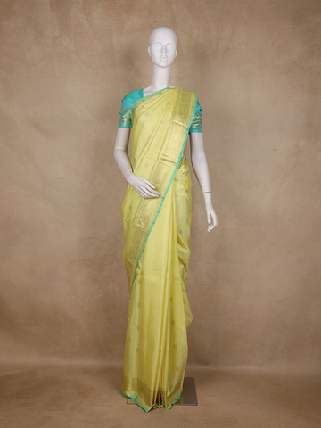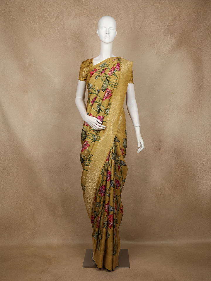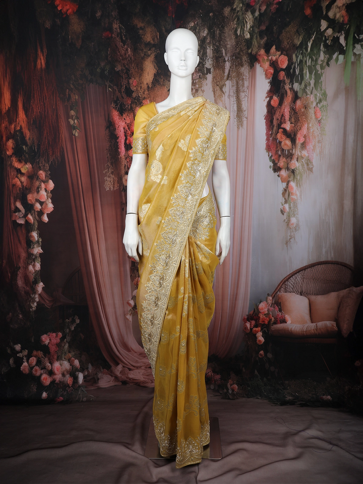 Light Yellow Organza Saree with Floral Prints on the body and Thread work Embroidery Border - Diadem