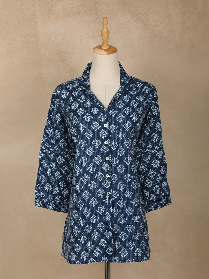Dark Blue Floral Printed Cotton Kurti Top - Diadem