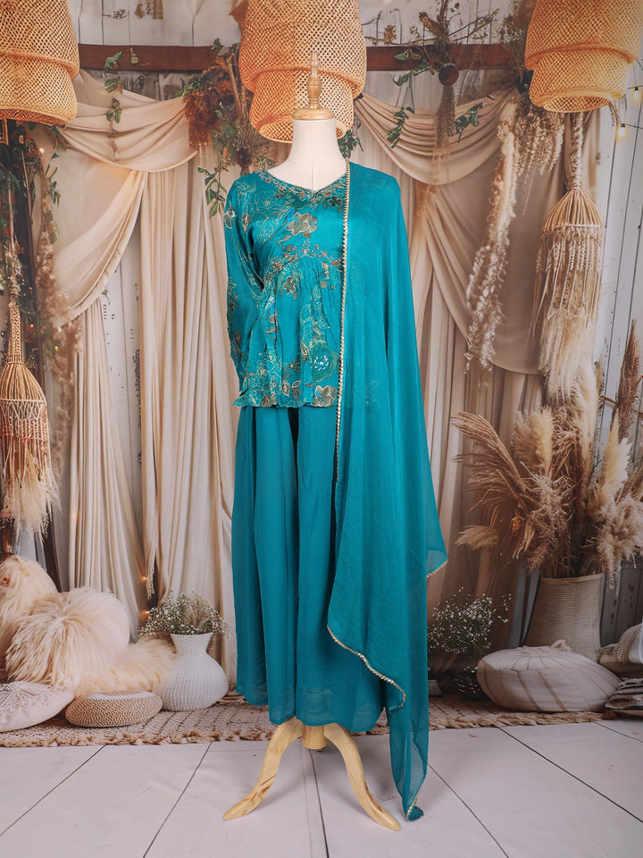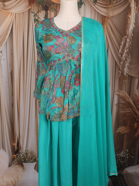 Aqua Blue Palazzo Salwar Suit for Girls Embellished with Sequins and Stripes Floral Design - Diadem