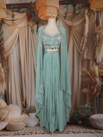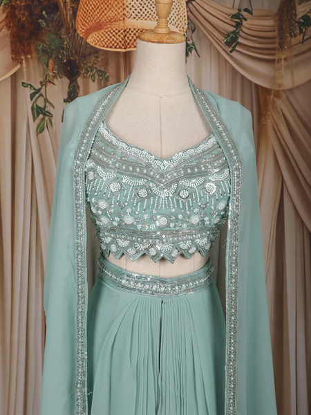 Teal Green Floral Design Sequin Embellishment Georgette Skirt Top - Diadem