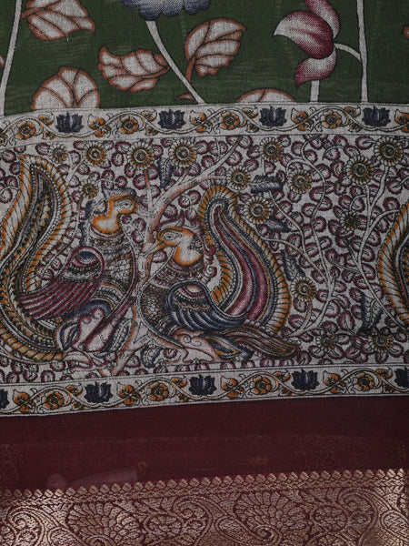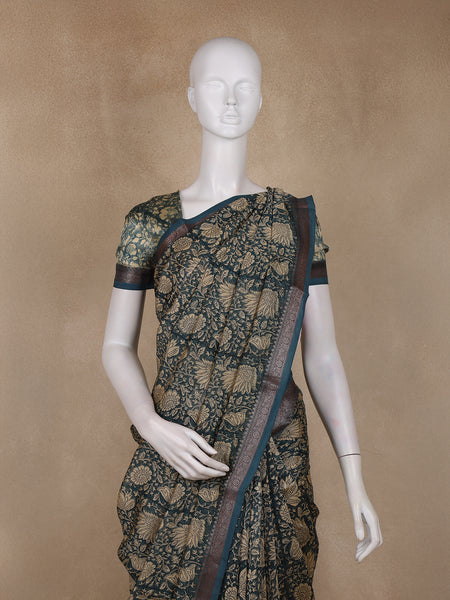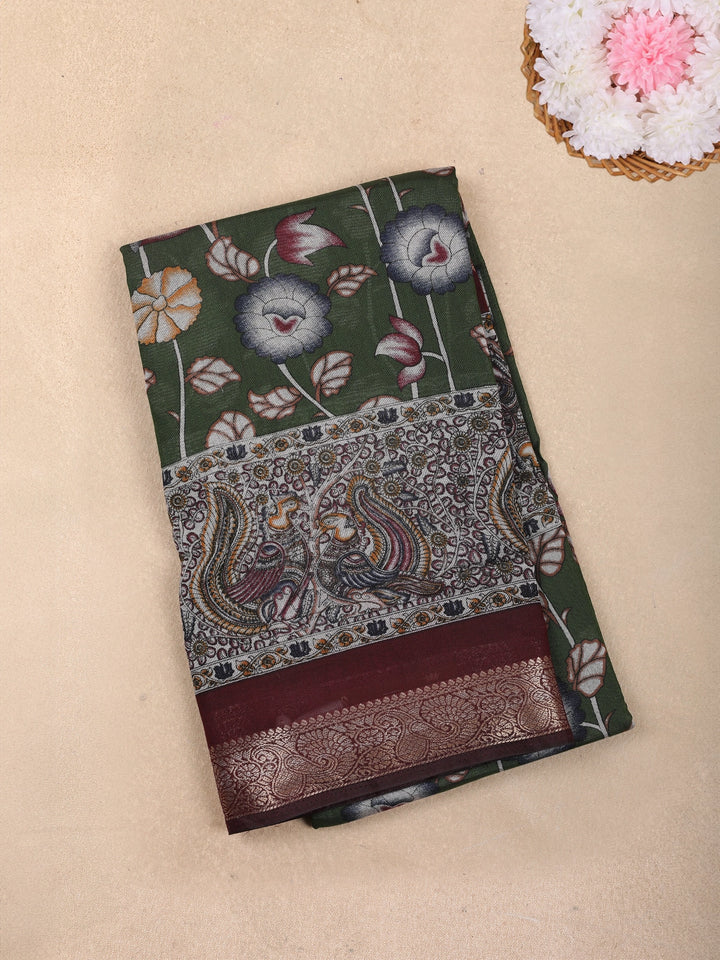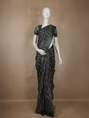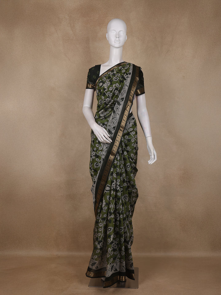 Bottle Green Floral Designed Cotton Saree - Diadem