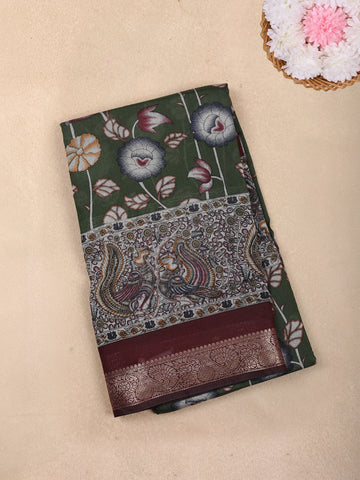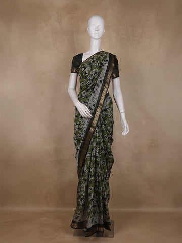 Olive Green Silk Cotton Saree with Flower Motifs Design on the Body with Contrast Border - Diadem