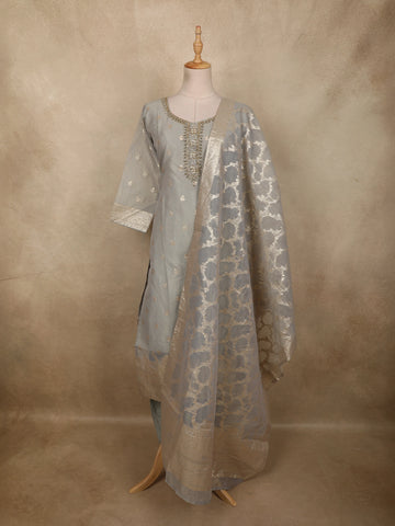 Grey Floral Design Woven Banarasi Silk Salwar Suit - Diadem