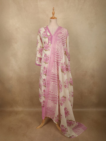 Pink And Beige Floral Designed Cotton Salwar Suit - Diadem