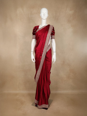 Pale Pink Satin Ready To Wear Saree With Plain Body Paired with Designer Blouse - Diadem