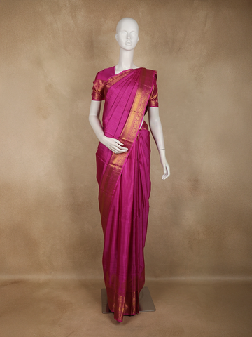 Rose Pink with a Gold Zari Border and Green Selvedge Edge Soft Silk Saree - Diadem