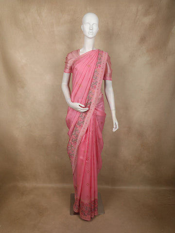 Pink with Multicolor Floral Print Tissue Silk Saree - Diadem