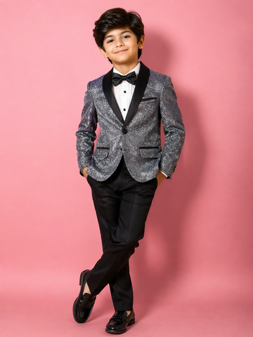 Silver Shimmer Tuxedo Full Sleeve Blazer for Boys - Diadem
