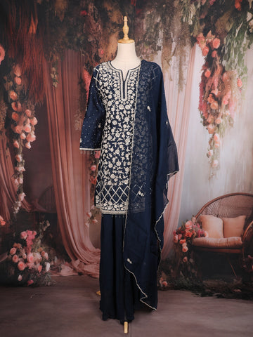 Navy Blue Floral Embroidered Georgette Indo-Western Lehenga With Cape - Diadem