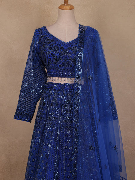 Navy Blue Sequins And Mirror Embroidered Net Bridal Lehenga Set - Diadem