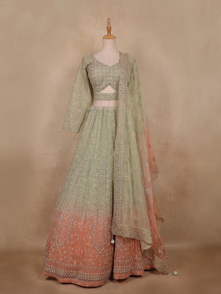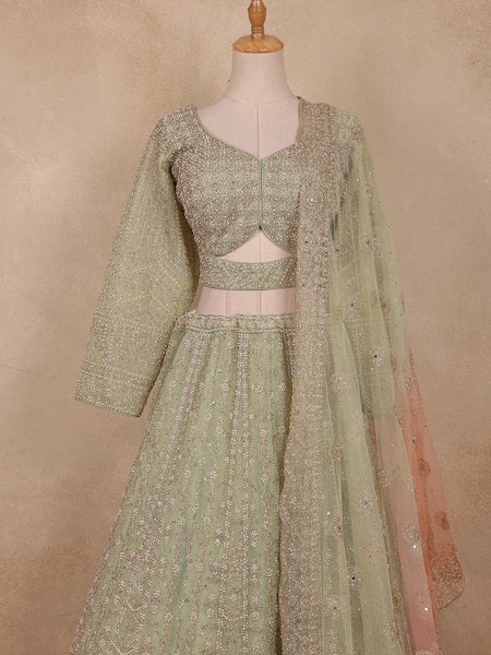 Teal Green Floral And Mirror Embroidered Net Bridal Lehenga Set - Diadem