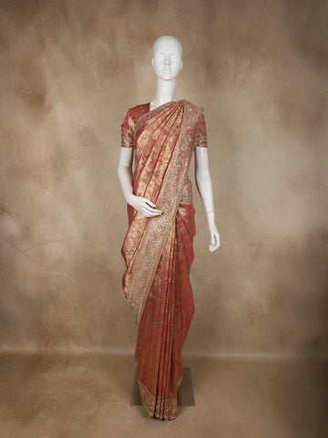 Romantic and soft, peach bridal silk sarees are ideal for daytime or spring weddings. Their subtle tones, paired with exquisite embroidery and beadwork, create a look that is warm and graceful, perfect for modern brides.