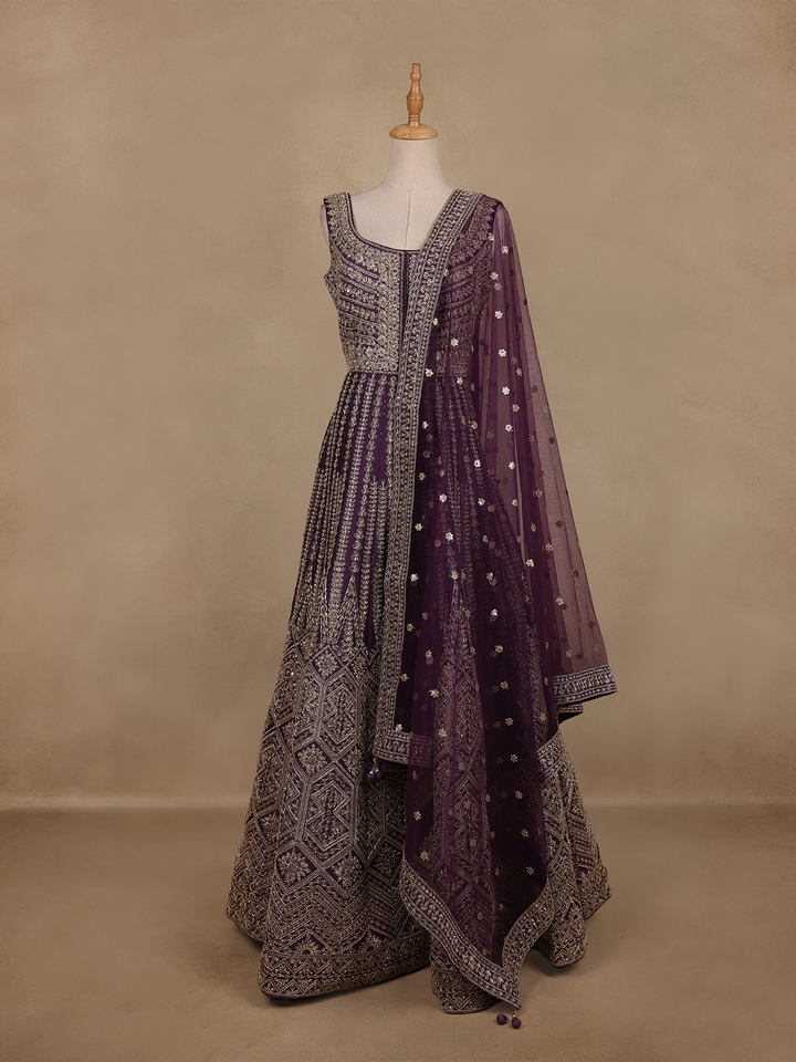 Purple Floral Embroidered Banarasi Silk Gown With Net Dupatta - Diadem