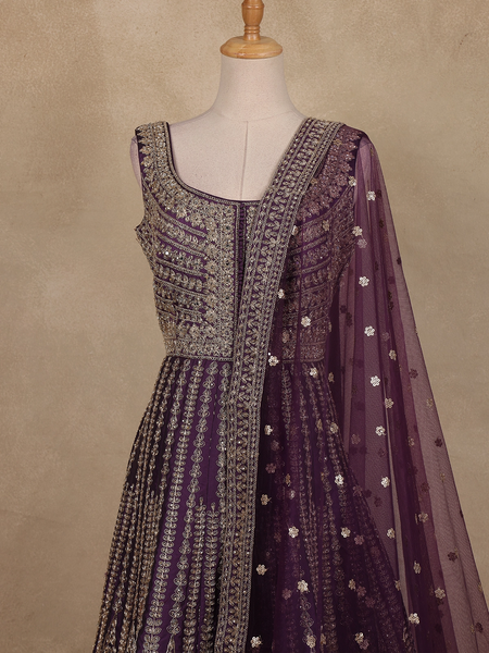 Violet Floral And Sequins Worked Net Party Wear Gown - Diadem