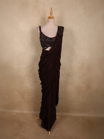Coffee Brown Sequin Embellished Crop Top with Draped Skirt - Diadem
