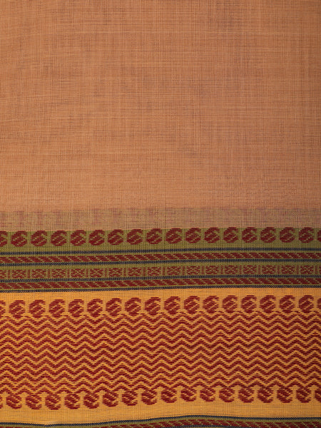 Brown Solid Design Cotton Saree With Contrast Green Zari Border - Diadem