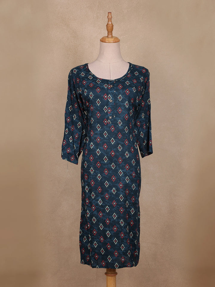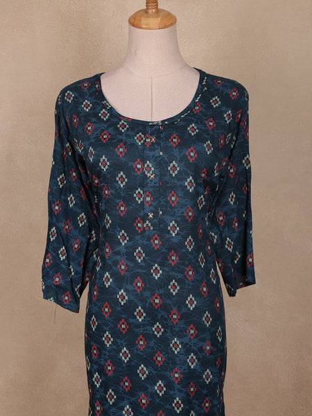 Navy Blue Cotton Kurti Top Adorned with Design Prints - Diadem