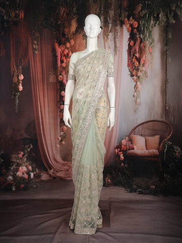 Pastel Olive Green Sequin Work Embroidery Designed Net Saree - Diadem