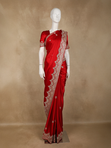 Bright Red Floral Embroidered Satin Saree - Diadem