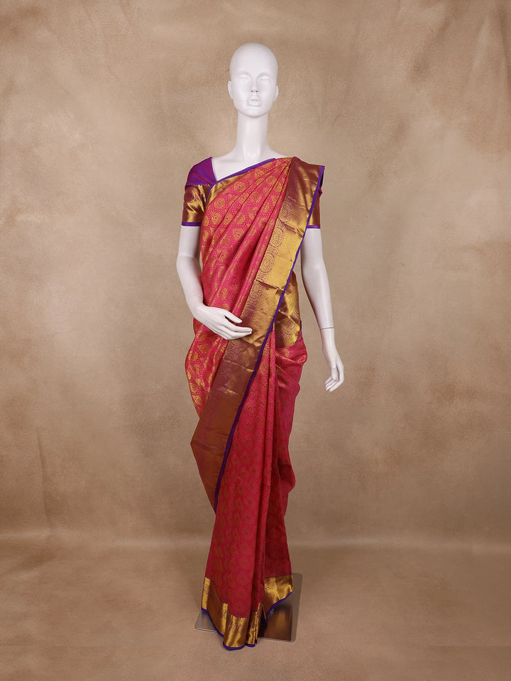 Pink And Purple Floral Motif Woven Pure Kanchipuram Silk Saree with Zari Border - Diadem