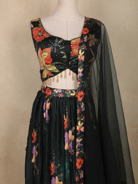 Black Floral Embroidered Chiffon Bridesmaids Lehenga - Diadem