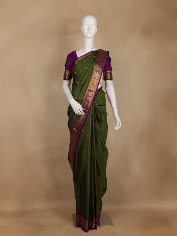 Green Floral Woven Pure Kanchipuram Silk Saree with Contrast Zari Border - Diadem