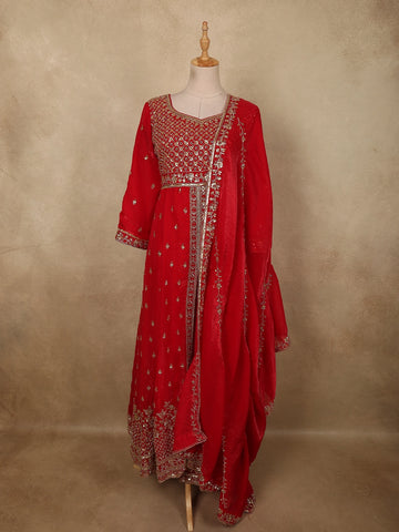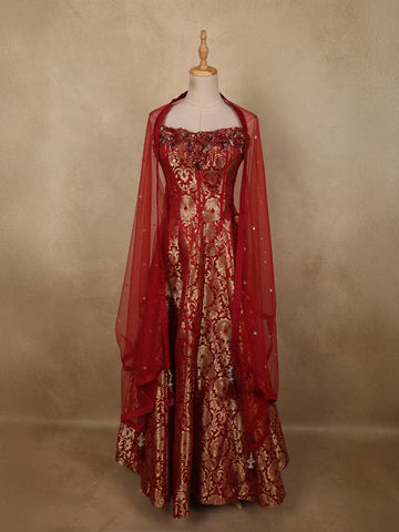 Red Full Sleeve Designer Bridal Lehenga with Floral Embroidery - Diadem