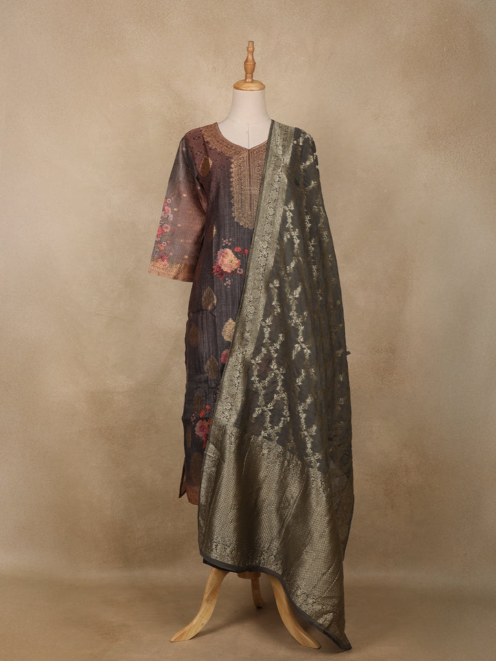 Tussar silk embroidered suits are known for their rich texture and natural golden sheen. The work on the embroidered salwar suit is often done with contrasting threads and intricate patterns, enhancing the beauty of tussar silk fabric, and making them a perfect choice for traditional ceremonies.