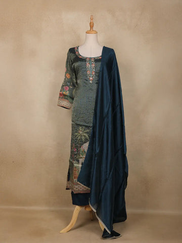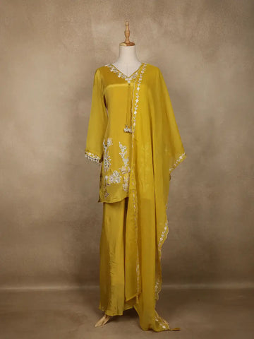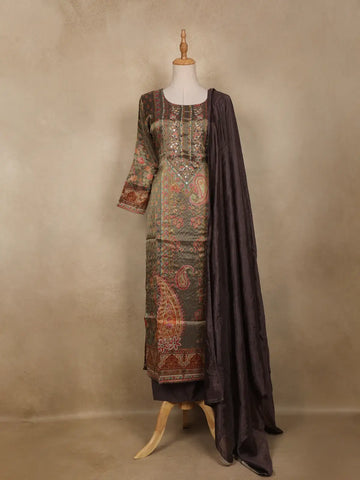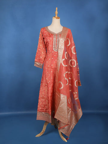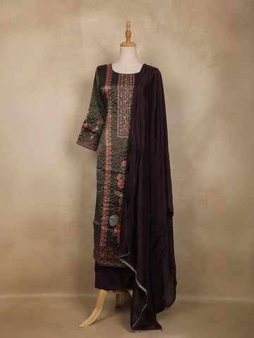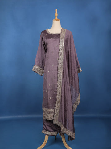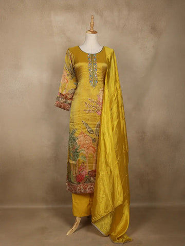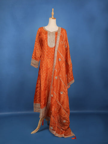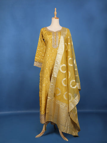 Tussar silk embroidered suits are known for their rich texture and natural golden sheen. The work on the embroidered salwar suit is often done with contrasting threads and intricate patterns, enhancing the beauty of tussar silk fabric, and making them a perfect choice for traditional ceremonies.