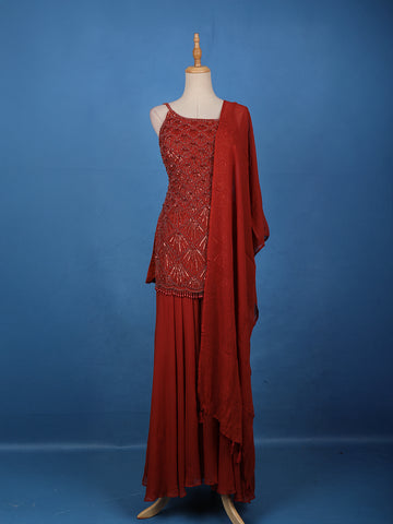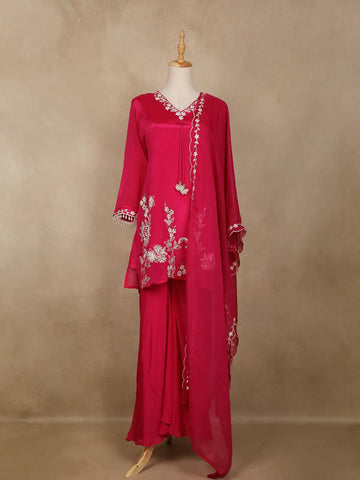The embroidered Sharara suit features a short kameez paired with wide-legged, flared pants known as shararas, and a dupatta. The sharara salwar suit embroidery design is perfect for occasions which call for a grandeur look such as festive celebrations.