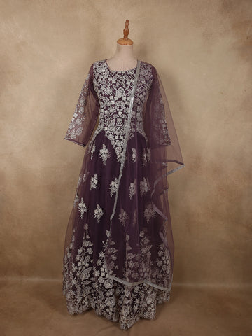 Red Panel Semi Silk Anarkali Full Sleeve Gown - Diadem