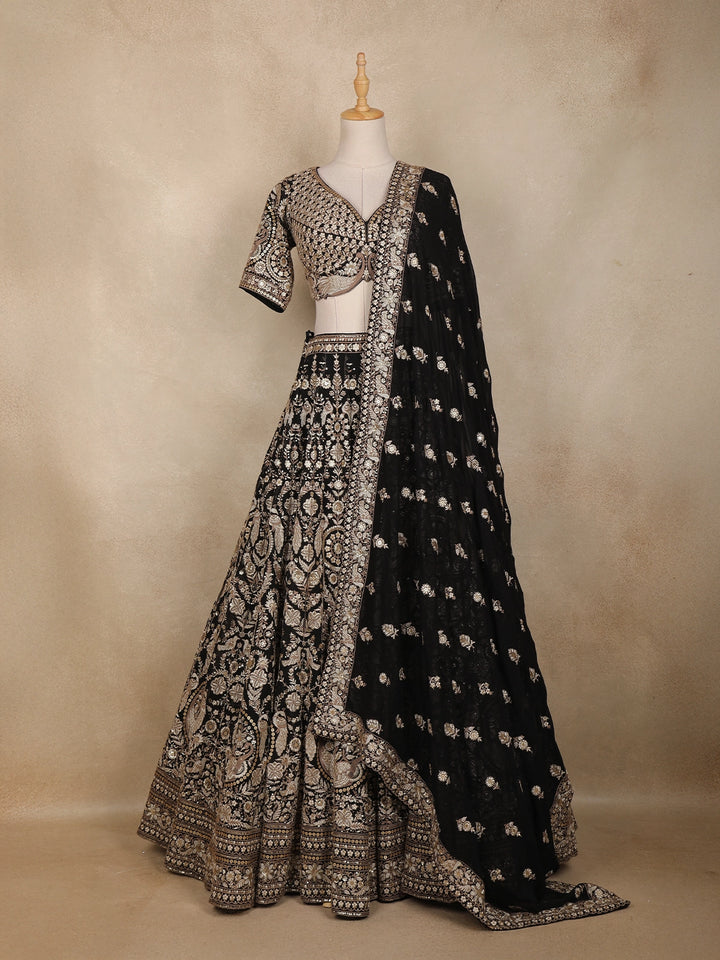 For brides who love a little sparkle, a sequin lehenga design for engagement adds glamour and finesse to the overall engagement lehenga look. This sequin lehenga for engagement bride is perfect for ceremonies conducted in the evenings as it creates a dazzling effect.