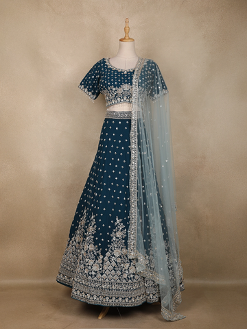 The light and airy net lehenga for engagement function brings a dreamy, ethereal vibe with layers of sheer fabric. This fabric offering a traditional Indian engagement look in Lehenga is adorned with sequins or lacework perfect for beachside as well as palace engagement ceremonies.