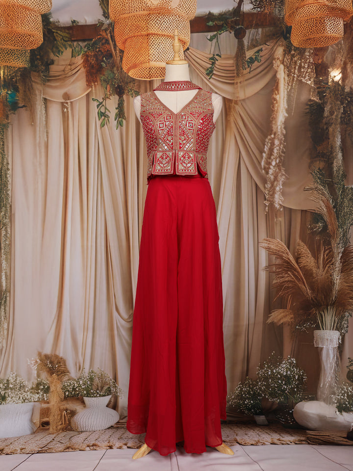 Bright Red Floral Print Crepe Palazzo Salwar Suit - Diadem