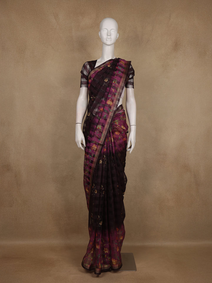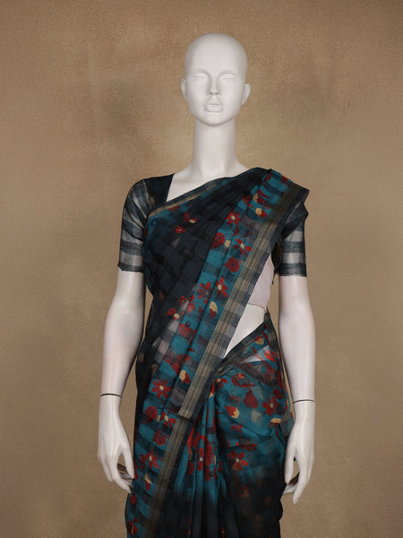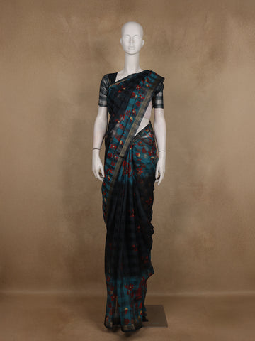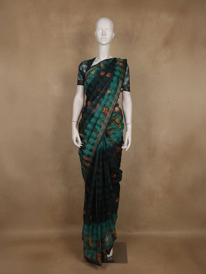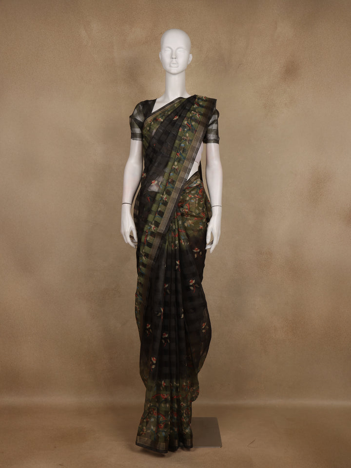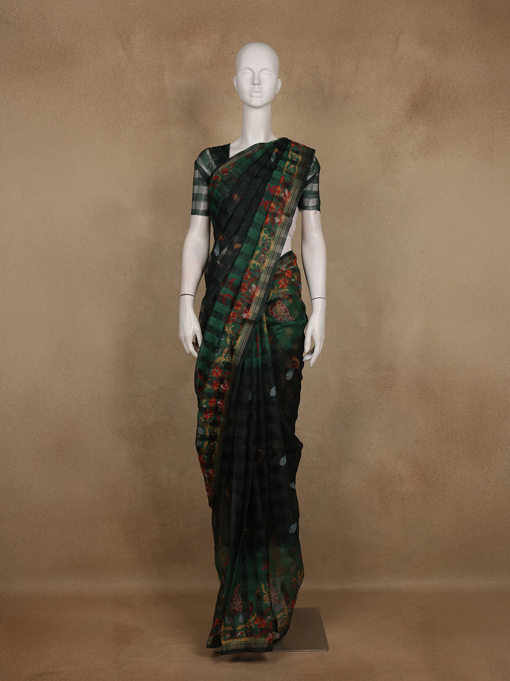 Green Semi Banarasi Saree with Floral Motif on the body and Zari Border - Diadem