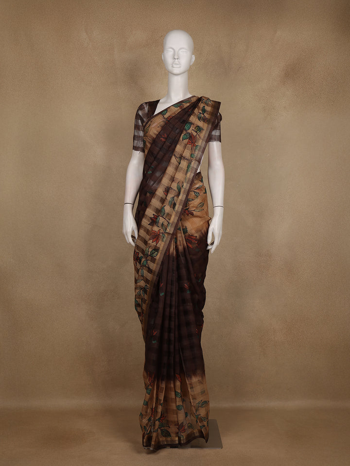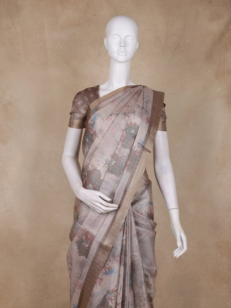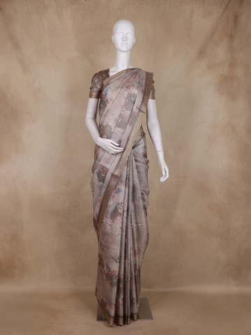 Light Yellow Organza Saree with Floral Prints on the body and Thread work Embroidery Border - Diadem