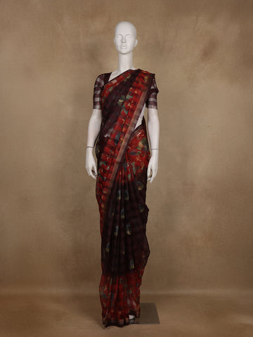 Red Organza Saree with Floral Pattern on the Body with Designed Border - Diadem