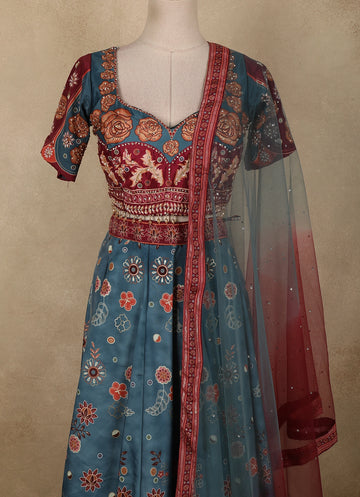 Taupe Grey Floral Design Organza Lehenga - Diadem