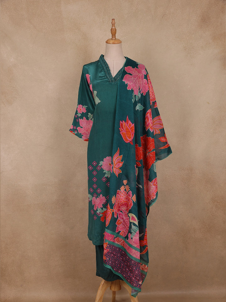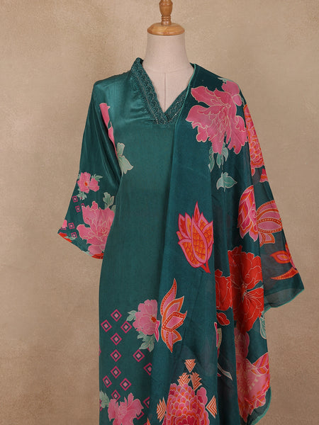 Teal Blue Sequins Design Floral Printed Banarasi silk Salwar Suit - Diadem