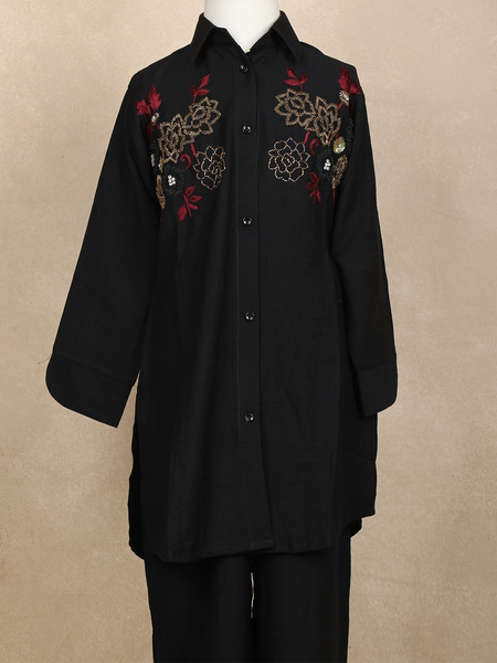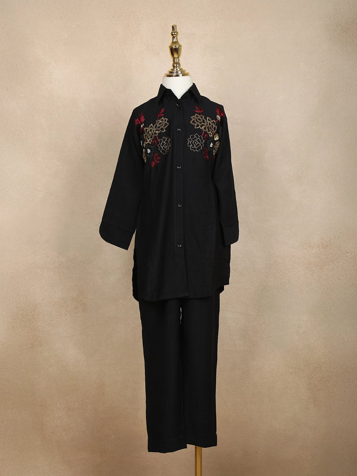 Black Floral Embroidered Georgette Kids Palazzo Set with Sleeveless Top And Matching Purse - Diadem
