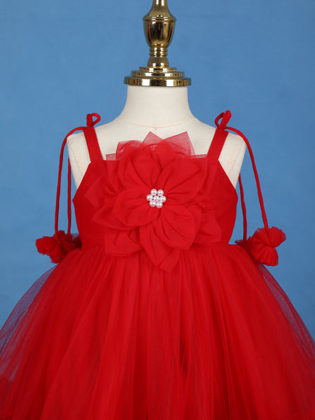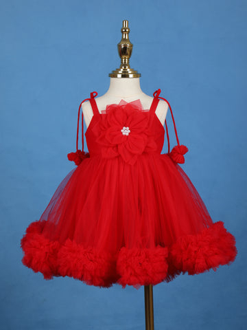 Red One-Shoulder Glitter Party Net Frock with Rhinestone Bow - Diadem