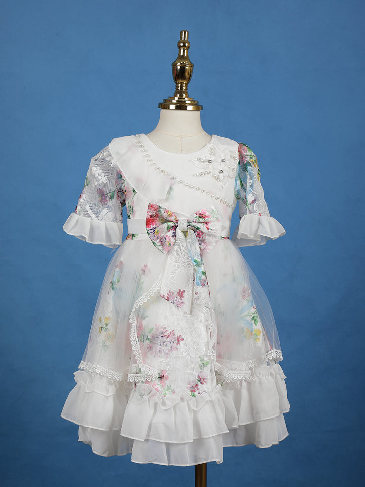 Off-White Rose Print Sleeveless Party Net Frock with Oversized Bow - Diadem
