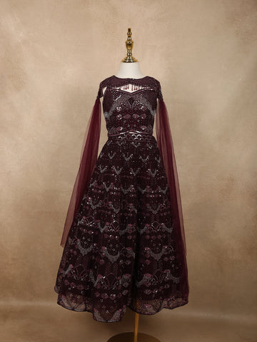 Wine Sequin Designed Satin Kids Gown - Diadem