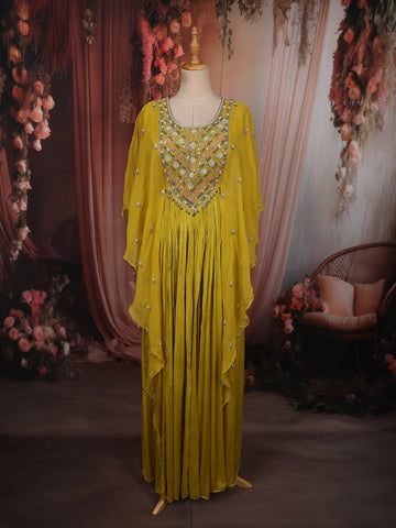 Indo-Western Haldi gowns with flow; washable embellishment so you can celebrate freely.