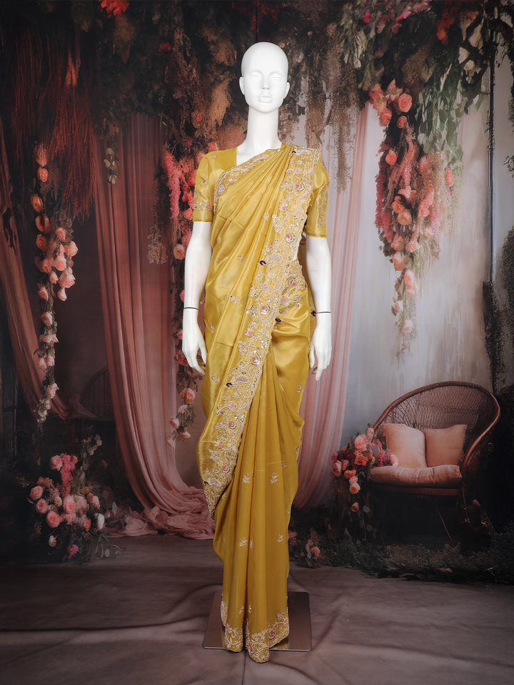 Light Yellow Organza Saree with Floral Prints on the body and Thread work Embroidery Border - Diadem