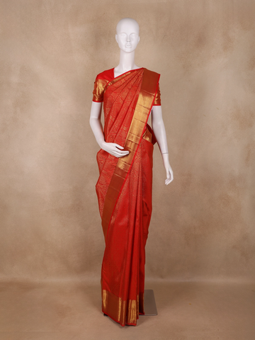 Orange Kanchipuram sarees are energetic and vibrant. These sarees are ideal for a bride looking to make a bold statement. Bright, fiery colours radiate warmth and joy, with rich zari embroidery enriching the saree's designs in depth and opulence.