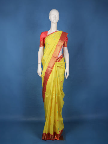 Yellow Pure Kanchipuram Silk Saree with Floral Designs on the Body and with Contrast Border - Diadem
